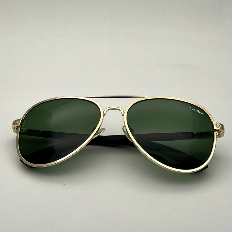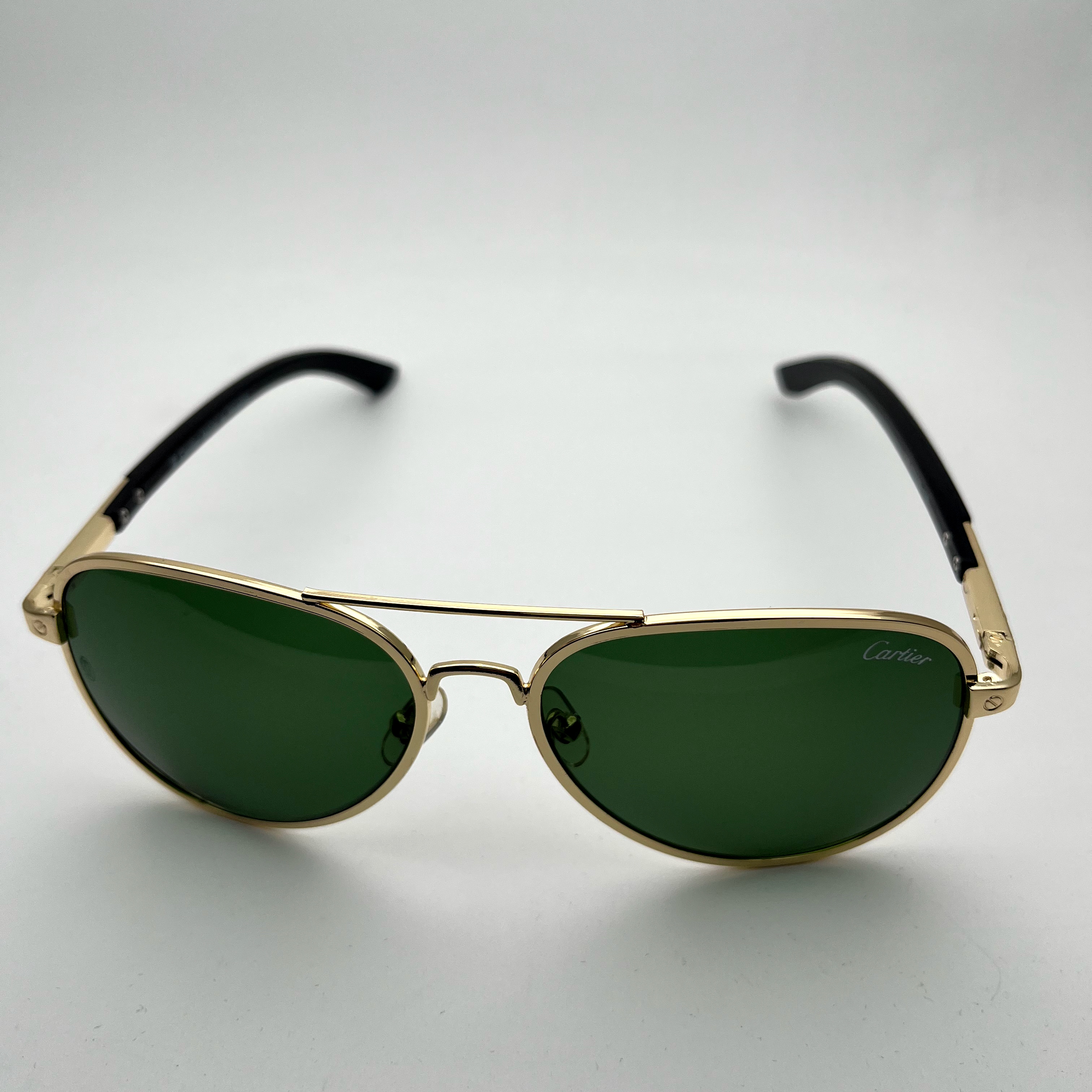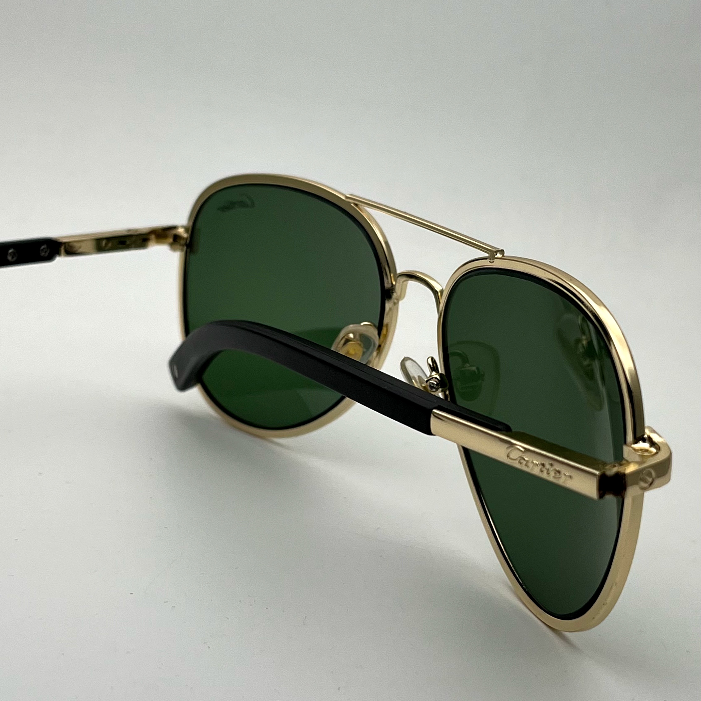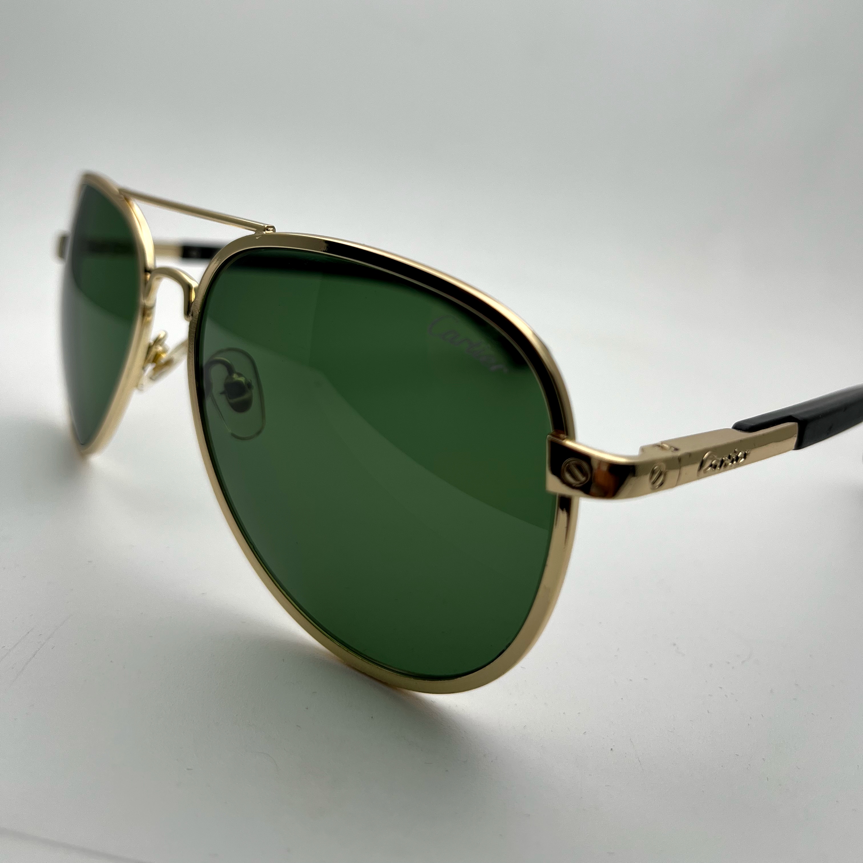 عینک کارتیر با ترکیب فریم طلایی و دستههای طرح چوب، جلوهای لوکس و کلاسیک دارد. عدسیهای سبز رنگ آن علاوه بر زیبایی، دیدی شفاف و طبیعی در نور آفتاب ایجاد میکنند. طراحی سبک و ارگونومیک این مدل باعث میشود حتی در استفاده طولانیمدت